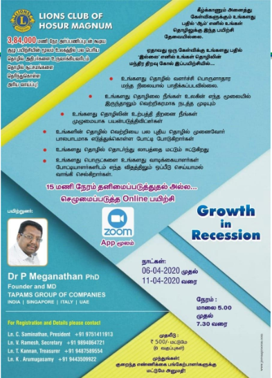 | 4/7/2020 | Turnaround Management | 7M Methodology - 1M - Marketing | Dr P Meganathan PhD – MD Tapams Group | CEOs / Owners of SMEs from Hosur | 4/6/2020 | Growth in recession | Surviving the Recession | Dr P Meganathan PhD – MD Tapams Group | CEOs / Owners of SMEs from Hosur |