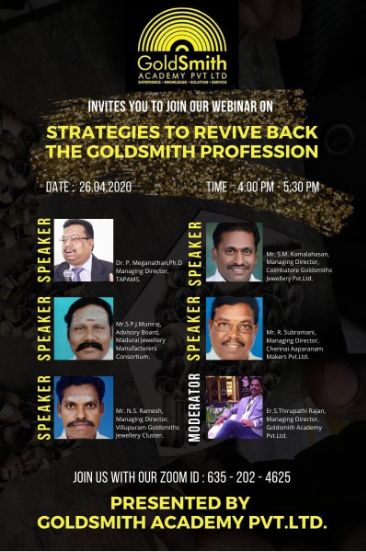 | 4/26/2020 | Strategies to Revive back the Goldsmith Industry | Bringing the 3rd Generation of Glodsmiths into the Business and exploring new startegies | Dr P Meganathan PhD – MD Tapams Group & S. Thirupathi Rajan - MD of Goldsmith Academy | Goldsmiths, Jewellery Manufacturers and Jewellery Shop Owners |