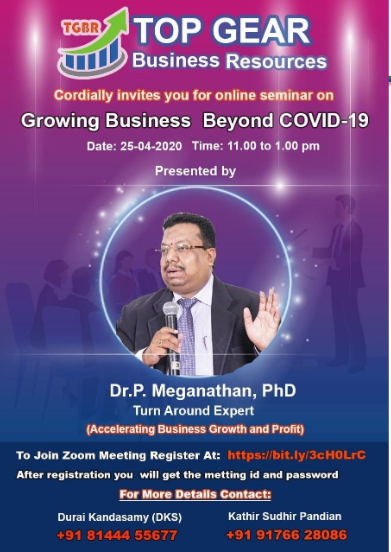 | 4/25/2020 | Growing Business beyond Covid - 19 | Exploring Opportunities during Covid - 19 | Dr P Meganathan PhD – MD Tapams Group | Entrepreneurs and Top Management Echelons |
