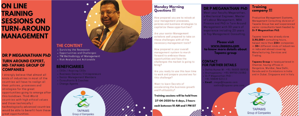 | 4/30/2020 | Turnaround Management | 7M Methodology - 3M - Management | Dr P Meganathan PhD – MD Tapams Group | CEOs, MDs, Plant Heads, VPs & Top Management Echelons |
