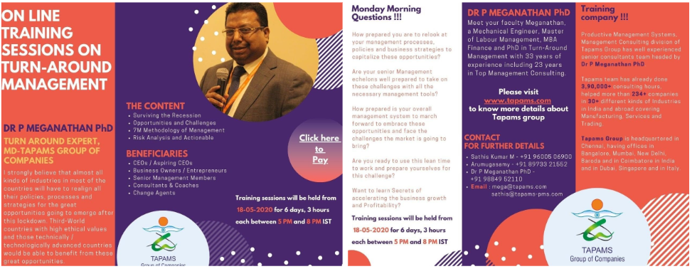 | 5/20/2020 | Turnaround Management | 7M Methodology - 2M - Money | Dr P Meganathan PhD – MD Tapams Group | CEOs, MDs, Plant Heads, VPs & Top Management Echelons |