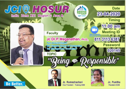 | 4/23/2020 | Being Responsible | Being Responsible for own life | Dr P Meganathan PhD – MD Tapams Group | Members of Junior Chamber International India |