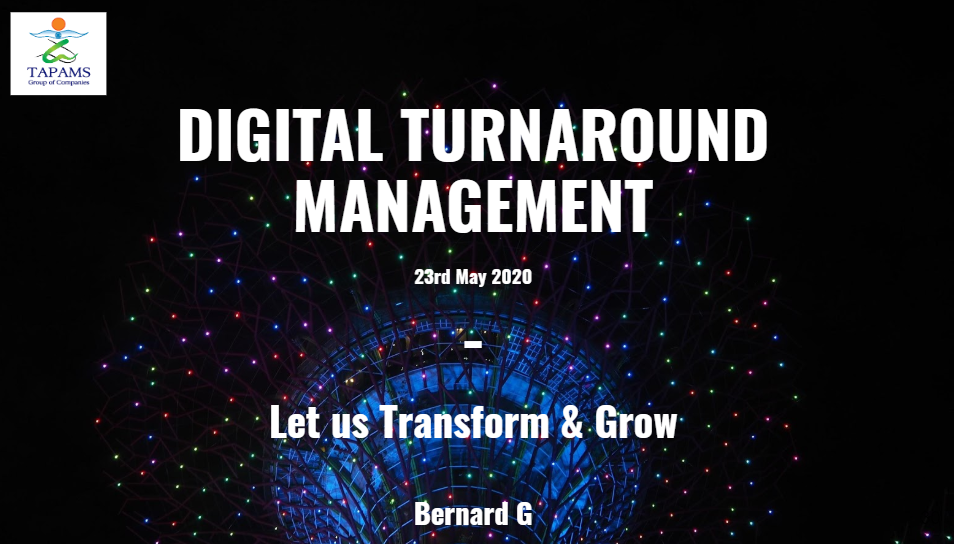 | 5/23/2020 | Digital Turnaround Management | Let us transform & Grow | Mr. G. Bernard, Chief Digital Officer - Tapams Group | CEO's, Entrepreneurs, Top & Senior Management |