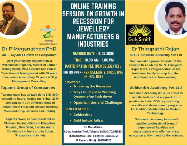 | 5/15/2020 | Growth in recession for Jewellery Manufacturing & Industries | Handling the recession during Covid-19 | Dr P Meganathan PhD – MD Tapams Group | Goldsmiths, Jewellery Manufacturers and Jewellery Shop Owners |
