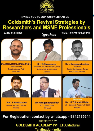 | 5/3/2020 | GoldSmith's Revivel Strategies by researchers and MSME professionals | Business and exploring new startegies | Dr P Meganathan PhD – MD Tapams Group & S. Thirupathi Rajan - MD of Goldsmith Academy | Goldsmiths, Jewellery Manufacturers and Jewellery Shop Owners |